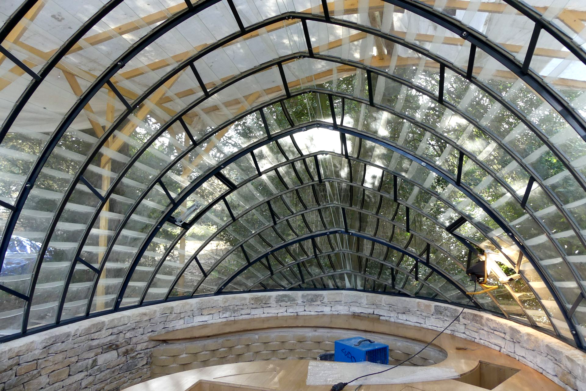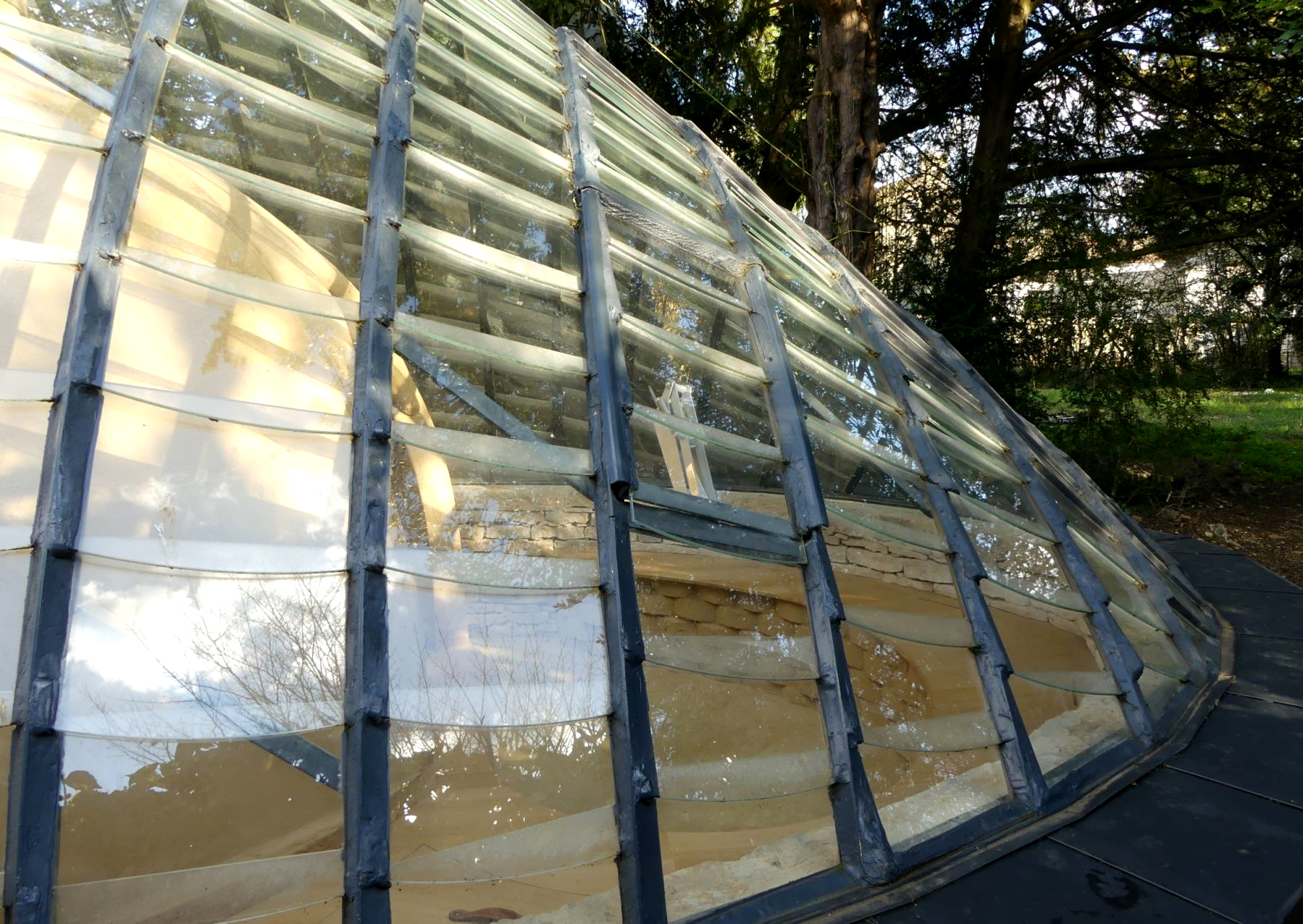 C'est une verrière cintrée en acier thermolqué. La toiture est en tuilles de verre écailles. Le verre est un produit feuilleté.